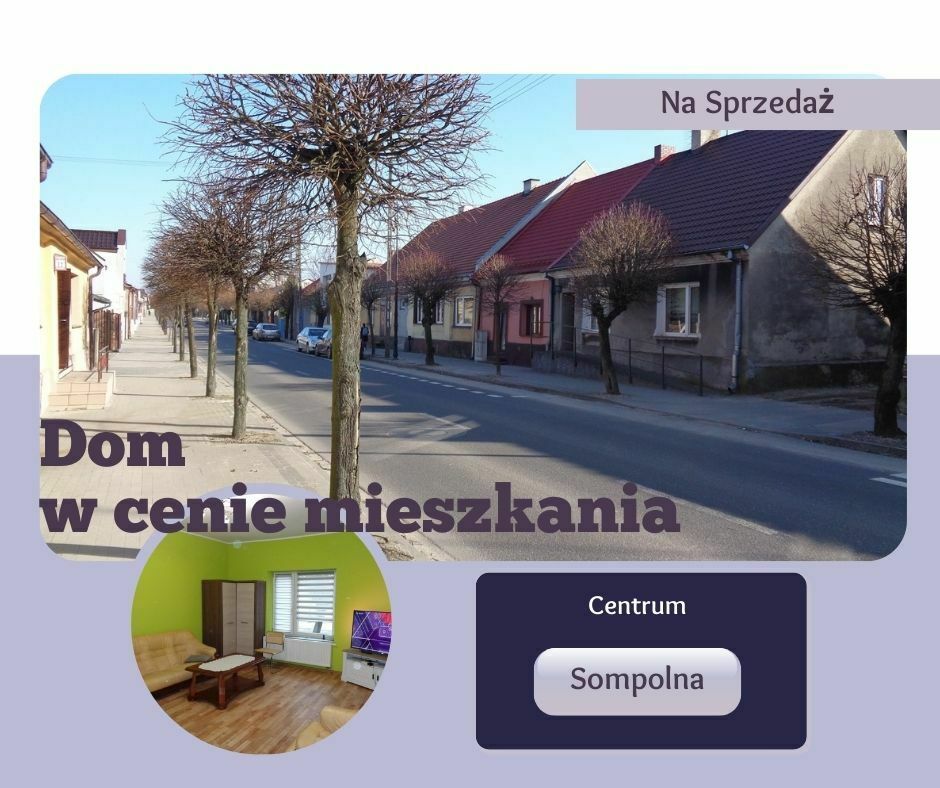 Sprzedam dom jednorodzinny w cenie mieszkania w Sompolnie o pow. użytkowej około 65 m2 wraz z dwoma garażami. Nieruchomość świeżo po remoncie, do zamieszkania lub idealnie nadająca się na prowadzenie działalności gospodarczej (biuro, gabinet). Działka częściowo zagospodarowana z licznymi nasadzeniami, ogrodzona siatką o powierzchni 3,80 ar. Dom z dwoma niezależnymi wejściami od ulicy (z podjazdem dla osób niepełnosprawnych) oraz od podwórza. Idealna lokalizacja, nieruchomość zlokalizowana w samym centrum miasta w niedalekiej odległości sklepy, apteka, markety, przychodnia, szkoła, dom kultury, rynek, przystanek , urząd. Wyszczególnienie pomieszczeń: pokój, kuchnia, łazienka, hol, korytarz. Na podłogach terakota i panele, ściany malowane, gipsowane oraz glazura. Budynek murowany z cegły, ze strychem, na dachu blacha, okna PCV. Ogrzewanie: piec na pellet o mocy 8 KW. Przyłącza woda, kanalizacja, prąd. Dojazd do posesji drogą asfaltową.Sprawdź zainteresowanie tym ogłoszeniem
